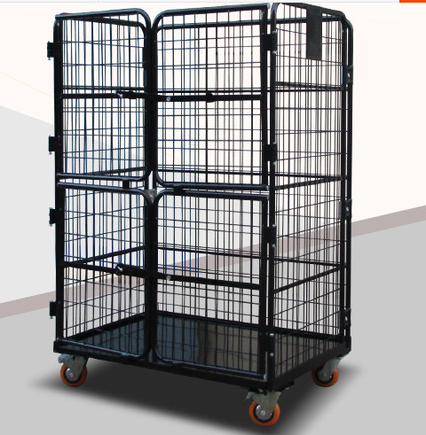 conteneurs grillagés sécurisés ou conteneurs grillagés de sécurité. Ces types de conteneurs grillagés sont fabriqués à partir de tubes d'acier robustes et de mailles de fil soudées, qui ont des coins chanfreinés et arrondis évitant les blessures pendant l'utilisation. De plus, la structure du conteneur grillagé verrouillable se compose de trois parois, d'un fond, d'un toit, d'une porte et d'un loquet robuste pour cadenas. Ce type de structure garantit que les marchandises sont transportées et stockées en toute sécurité. De plus, au fond, il y a deux roulettes fixes et deux roulettes pivotantes pour faciliter le déplacement. Des étagères sont disponibles en tant qu'accessoires.