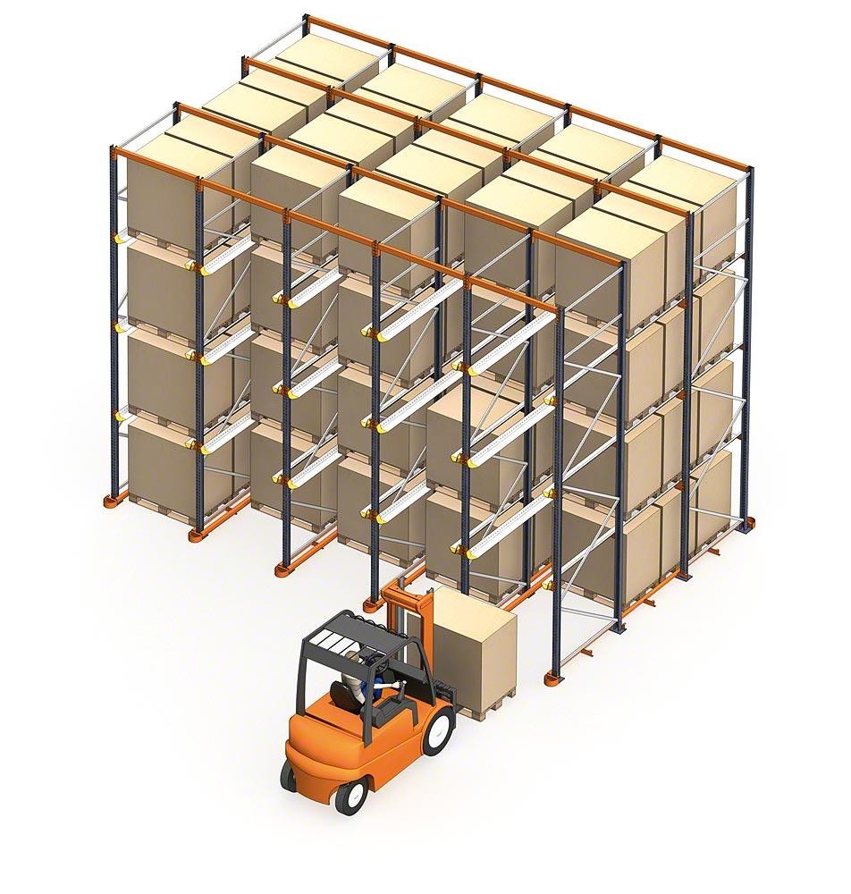 Le rayonnage Drive-through/In est un système premier entré, premier sorti (FIFO). Il est adapté au stockage de grandes quantités et de petites variétés de marchandises, et le taux d'utilisation de l'espace de l'entrepôt est extrêmement élevé. Il a presque le double de la capacité de stockage dans le même espace que les étagères classiques de type à poutres, et est particulièrement adapté au stockage d'unités de marchandises standard.