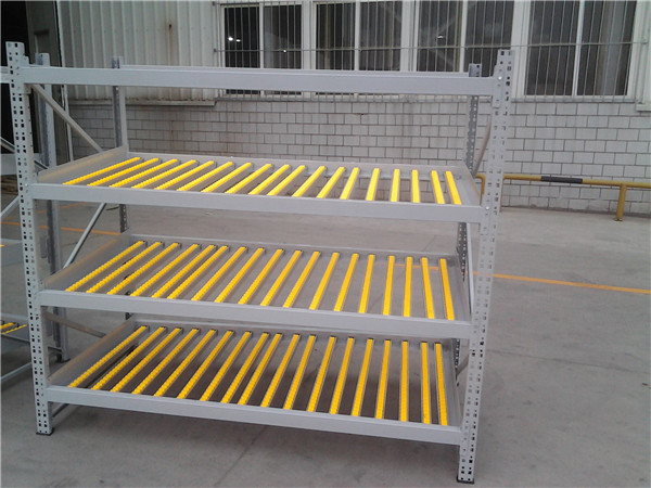 Il s'agit d'un système d'étagères composé de colonnes, de poutres, de rouleaux et d'amortisseurs.Il est principalement constitué d'étagères lourdes ou d'étagères de taille moyenne (sélectionnées en fonction des exigences de charge). La ligne de roulement est installée aux deux extrémités avec une certaine pente, qui peut réaliser le premier dans, le premier hors des marchandises par le poids de la cargaison.