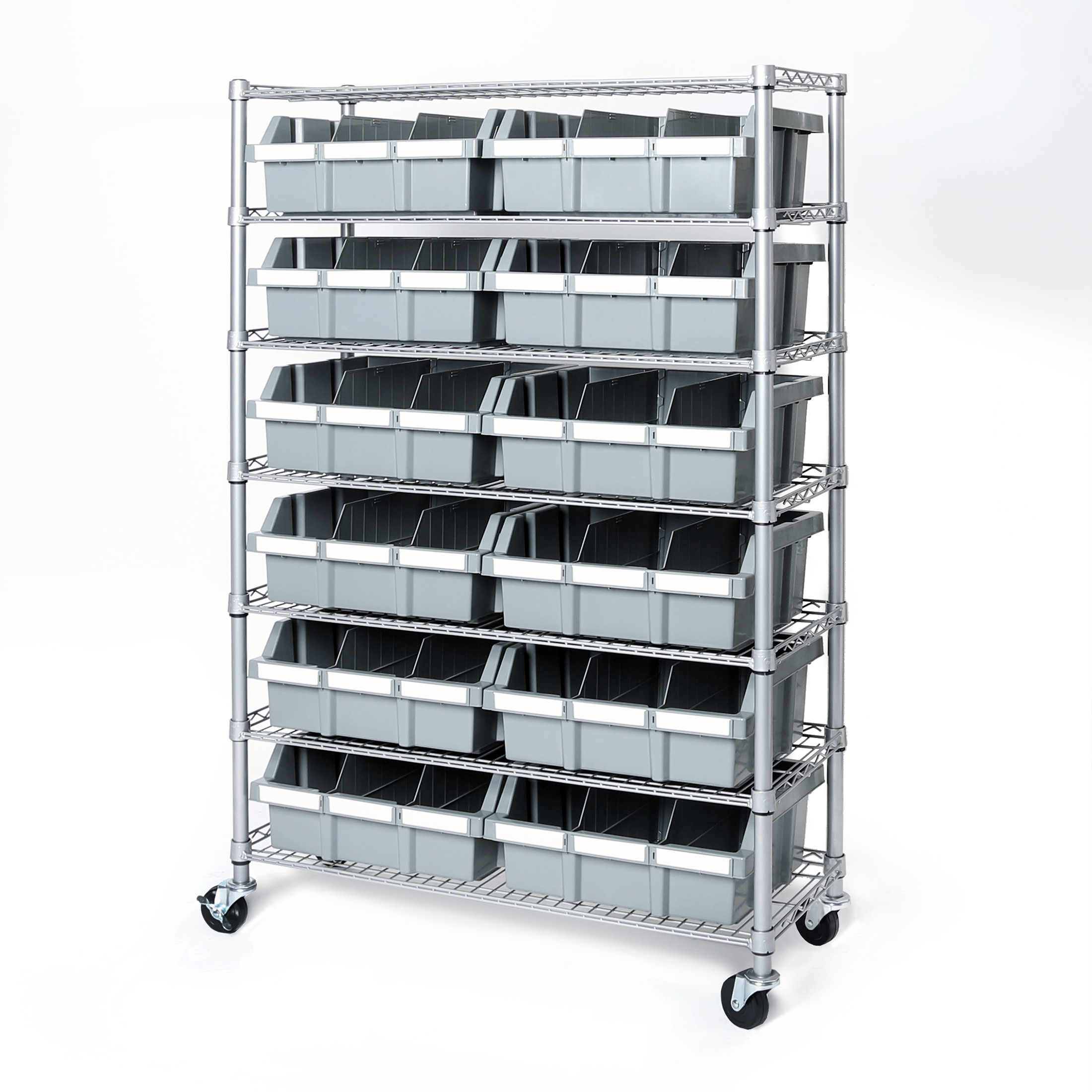 14" D x 42" W x 60" H ; 7 niveaux avec 12 boîtiers en PP et 4 rouleaux (deux verrouillage); 12 boîtiers en polypropylène (PP) durables coulissants et verrouillants (12 XL).Capacité de poids totale de l'unité sur roulettes (partagée uniformément): 500 lb; équipement alimentaire, pour la maison, le restaurant commercial et les bureaux.