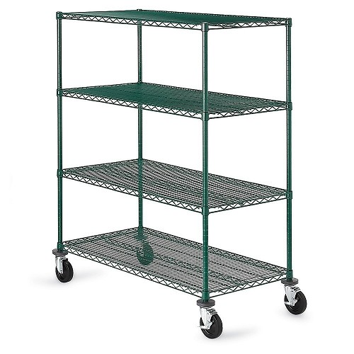| 1) Article | Étagère métallique commerciale mobile à fil époxy vert à 4 niveaux dans un environnement de culture en serre |
